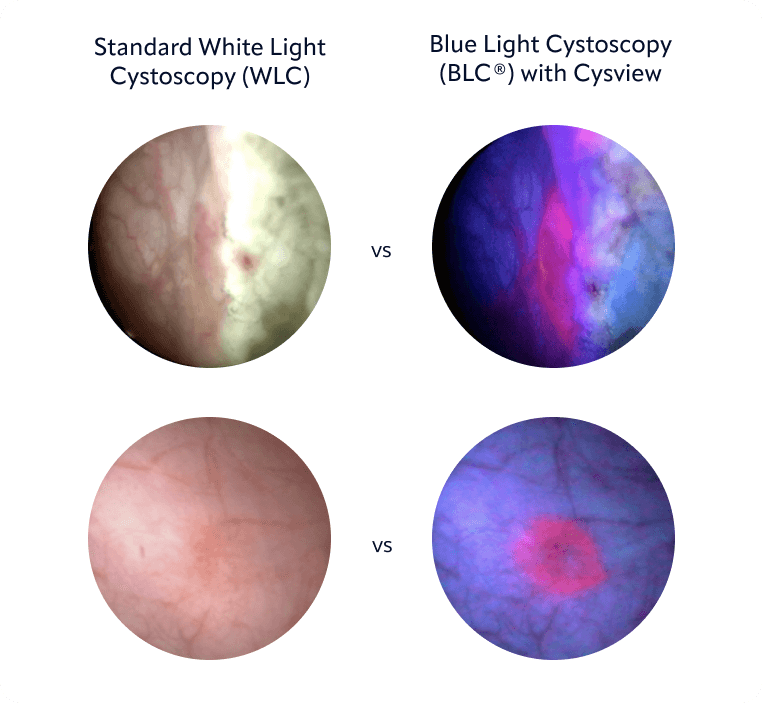 1. Cysview [prescribing information]. 2019:1–4. 2. Chang SS, Boorjian SA, Chou R, et al. Diagnosis and Treatment of Non-Muscle Invasive Bladder Cancer: AUA/SUO Guideline. J Urol. 2016;196(4):1021–1029. Amended 2020. 3. Cumberbatch MGK, Foerster B, Catto JWF, et al. Repeat Transurethral Resection in Non-Muscle Invasive Bladder Cancer: A Systematic Review. Eur Urol. 2018;73(6):925–933. 4. Daneshmand S, Patel S, Lotan Y, et al. Efficacy and Safety of Blue Light Flexible Cystoscopy with Hexaminolevulinate in the Surveillance of Bladder Cancer: A Phase III, Comparative, Multicenter Study. J Urol. 2018;199(5):1158-1165. 5. Witjes JA, Babjuk M, Gontero P, et al. Clinical and Cost Effectiveness of Hexaminolevulinate-Guided Blue-Light Cystoscopy: Evidence Review and Updated Expert Recommendations. Eur Urol. 2014;66(5):863-871. 6. Xiong Y, Li J, Ma S, et al. A Meta-analysis of Narrow Band Imaging for the Diagnosis and Therapeutic Outcome of Non-Muscle Invasive Bladder Cancer. PLoS One. 2017;12(2):e0170819. 7. Richards KA, Smith ND, Steinberg GD. The Importance of Transurethral Resection of Bladder Tumor in the Management of Nonmuscle Invasive Bladder Cancer: A Systematic Review of Novel Technologies. J Urol. 2014;191(6):1655-1664. 8. Wachoska M, Muchowicz A, Firczuk M, et al. Aminolevulinic Acid (ALA) as a Prodrug in Photodynamic Therapy of Cancer. Molecules. 2011;16(5):4140–4164.